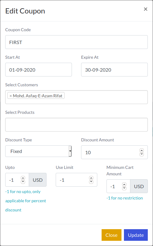 To add a coupon, click on Add New Coupon. A form will open in modal pop up. Enter a unique, uppercase coupon code, careful about start date and expire date. You can select customers if you want to valid this coupon for only a group of your customers. You can also choose products like customers. Up to amount will only valid for percentage discount type. You can set upto, maximum use limit count, minimum cart amount required for this coupon to be valid to -1 for default behavior. Click on save.