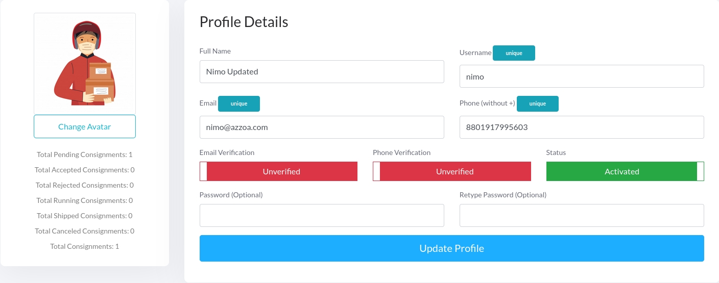 Click on pencil marked Edit button beside Delivery Man name from All Delivery Man Table screen. You can see some basic statistics of this delivery man below the Change Avatar button. Edit as you want and click on Update Profile.