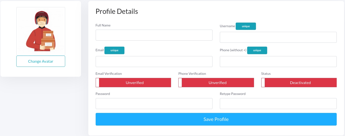 Click on Add New Delivery Man button to add new delivery man. Fill all the fields, select a avatar for this delivery man and click on Save Profile.
