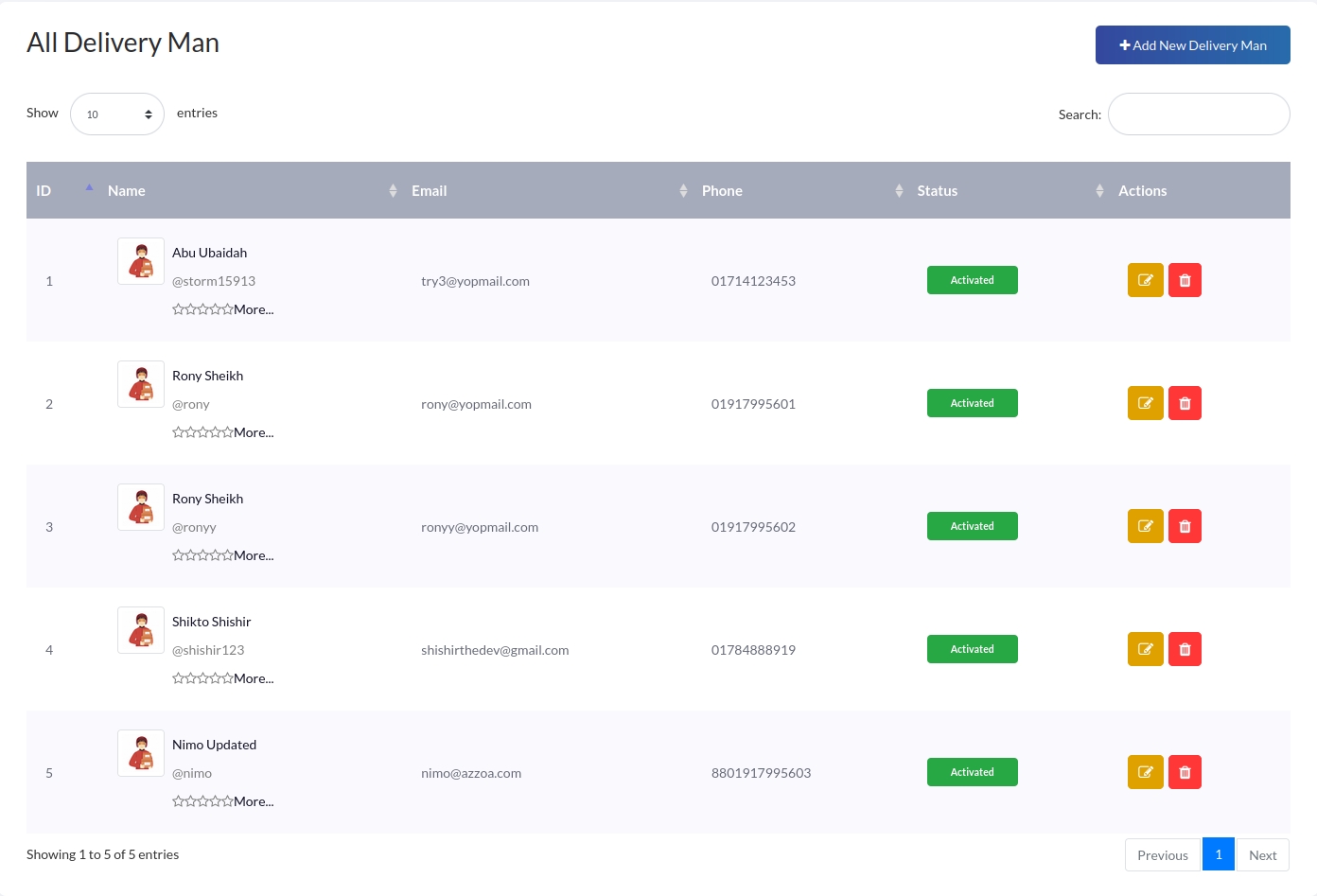 At the front page of delivery management, you will see a table with search, filter and sort facility. You will find all your delivery man listed here.