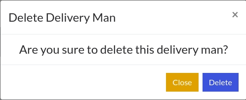 To delete a delivery man, click on trashed marked Delete button beside delivery man name and image from all delivery man table. A modal will pup up. Click on delete to confirm the modal.