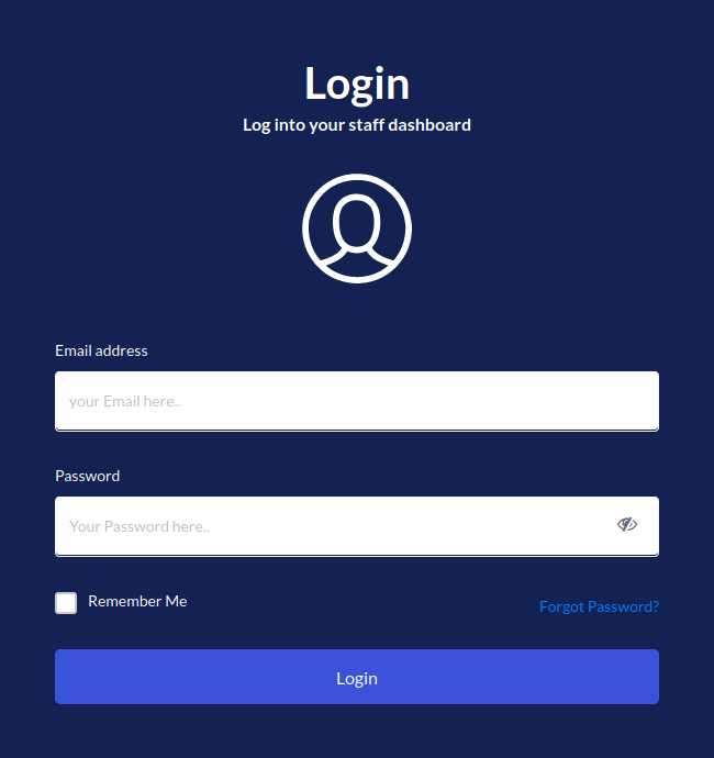 To get your Azzoa staff dashboard, you should login first. Navigate to your root URL (http://your-site-url.com). Enter your staff credentials (first staff is invisible super-admin) and click on login.