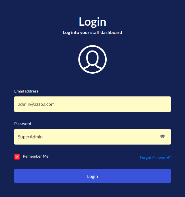 Click on exit button to log into your staff panel. Default Super Admin access is given bellow. Please make sure you changed this email and password after first login.