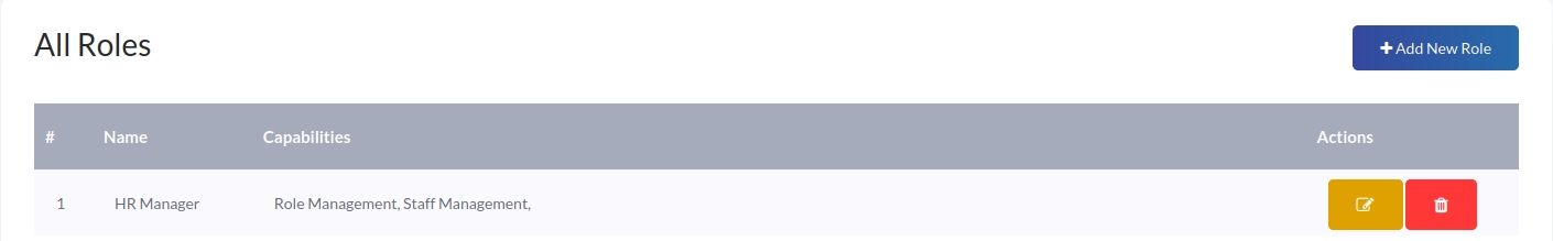 To edit a existing role, just click on Edit button with pencil icon beside the associated role. A modal with role informations will pop up. Just edit and click on Update.
