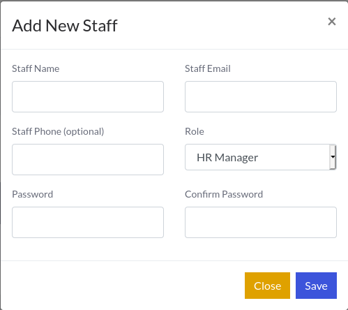 To create a staff, click on Add New Staff button. A modal will pop up. Fill all the fields (phone number is optional), select a Role you configured before and click on Save. You will see you staff listed in table.