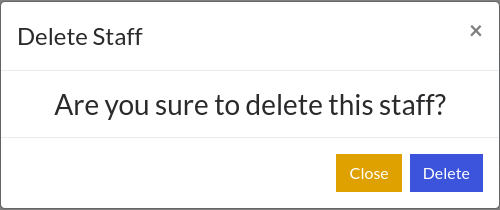 To delete a staff, just click on Delete button with trash icon beside the associated staff. A confirmation modal will pop up. Click on Delete.