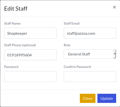 Click on Edit button with pencil icon beside the associated Staff . A modal will pop up as usual. Edit fields as you want to update and click on Update.