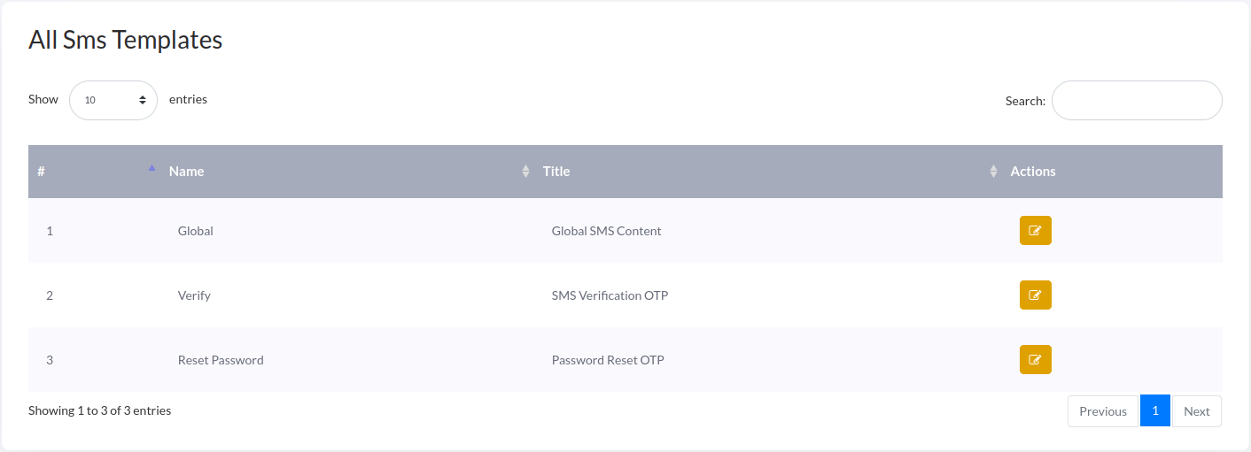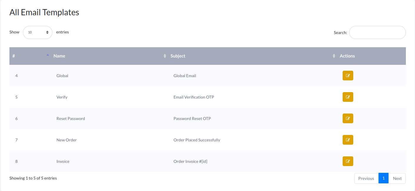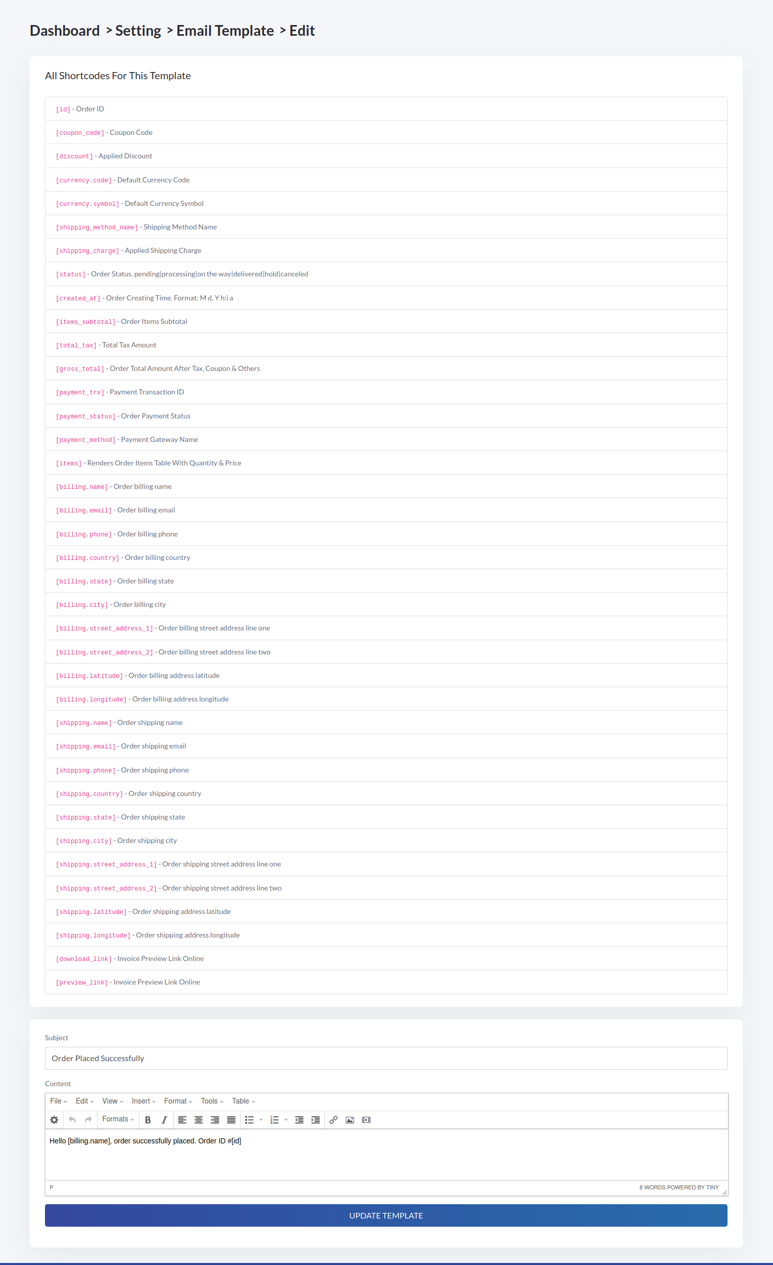 To edit a notification template, click on pencil marked button of associated template row. Please check all the short-codes of that template you can use in template text. Edit and save that template. Make sure you included all correct short-codes.