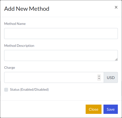To add a new shipping method, click on Add New Method button, a modal will pop up with input fields. Fill all required fields and please careful about Method Charge.