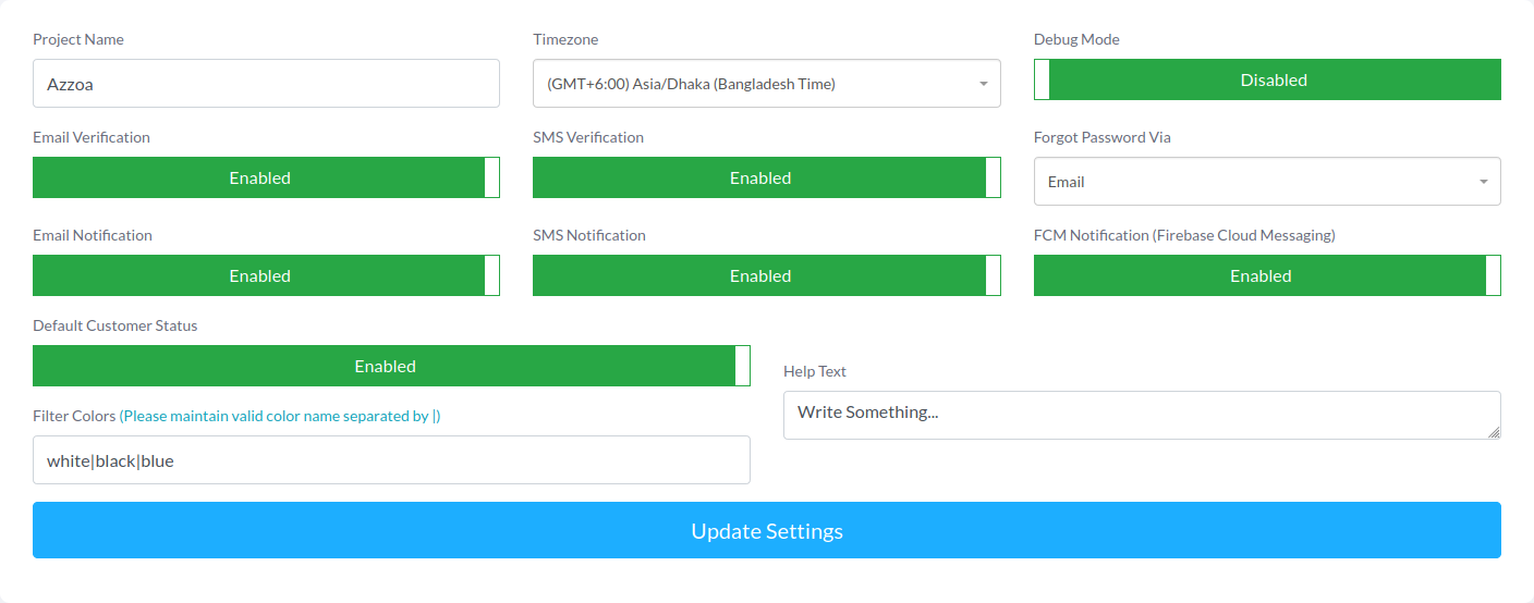 To get your Azzoa general settings, navigate to Setting >> General Settings. You can configure here some global setting like project name, timezone, debug mode, verification status, notification status etc.