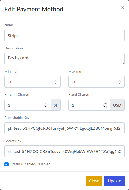 To configure a gateway, click on edit button from actions column and related gateway row. Careful about gateway credentials (API key, API Secret etc).