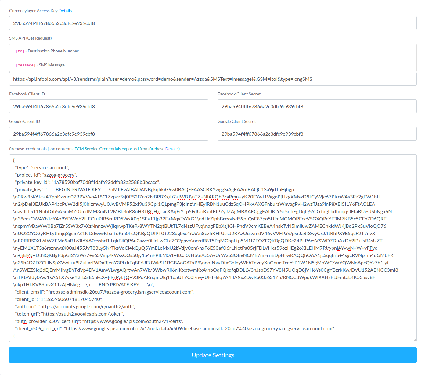 You can configure various external services like SMS API, Currencylayer API, Facebook Login App Credentials, Google Login Credentials and Firebase service credential JSON file to make your system working properly.